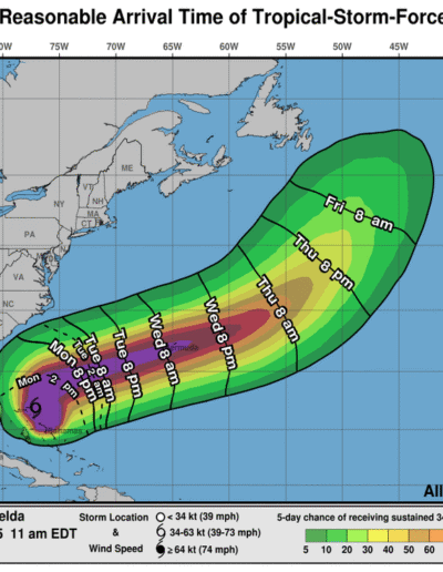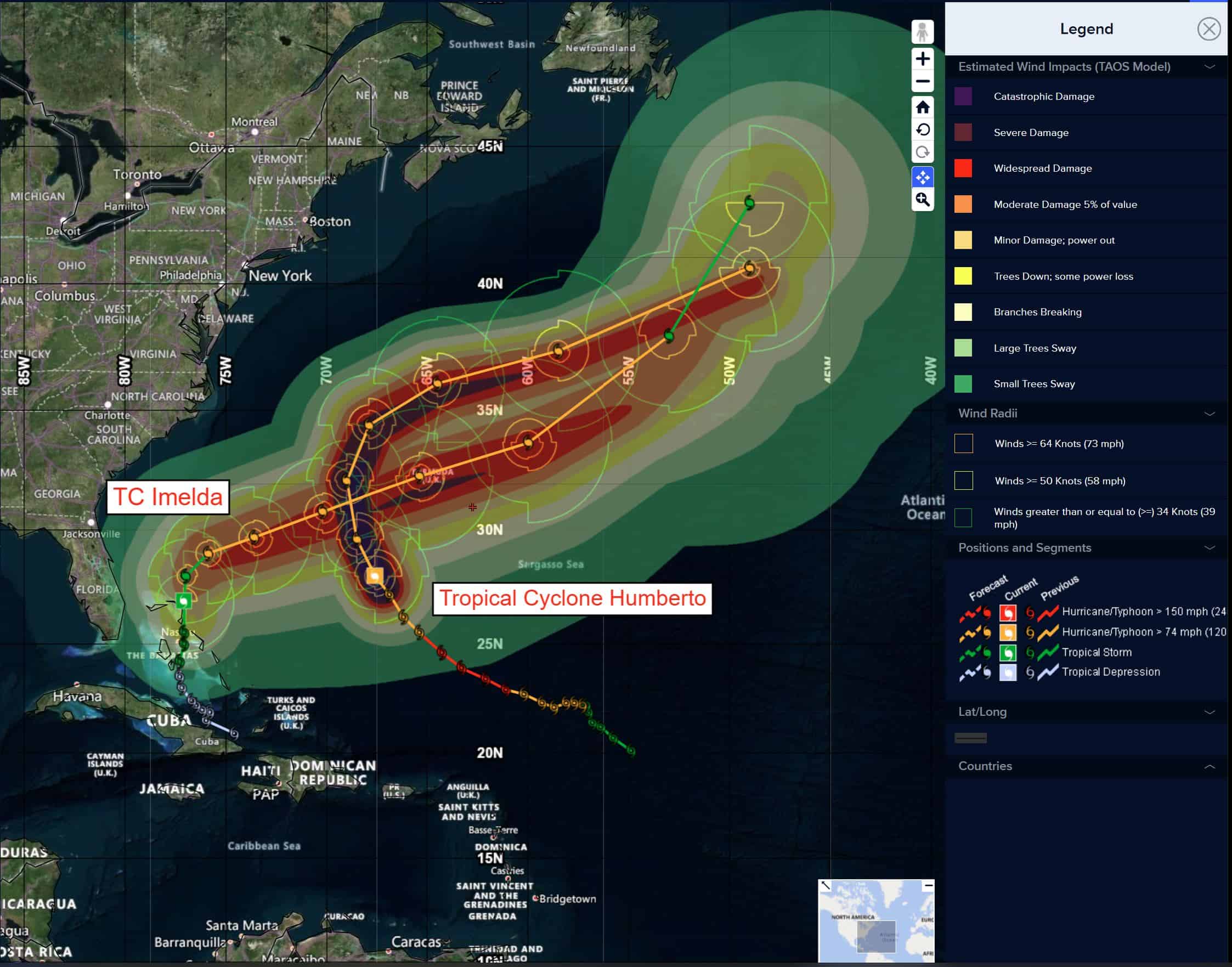 As Imelda passes near Bermuda, 2 to 4 inches – 50 to 100 mm – of rainfall is expected from Wednesday into Thursday.