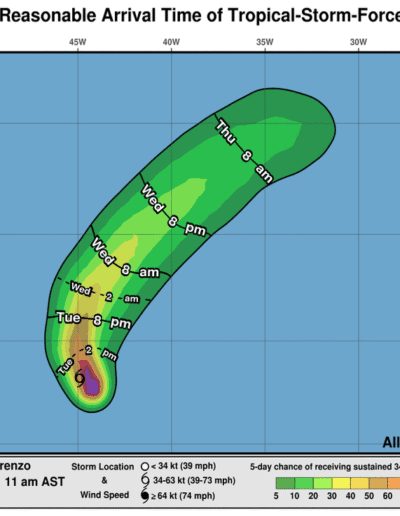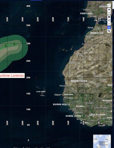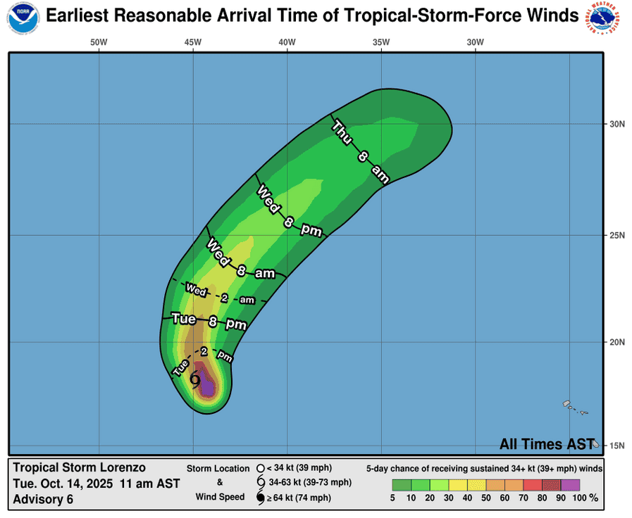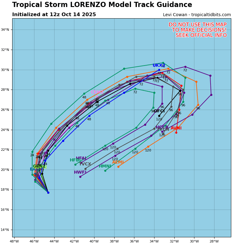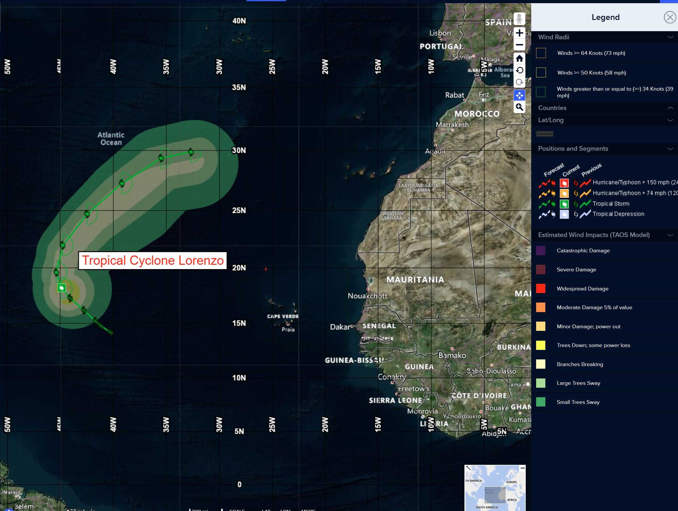 Tropical Cyclone Lorenzo is located about 1440 miles west-northwest of the Cabo Verde Islands