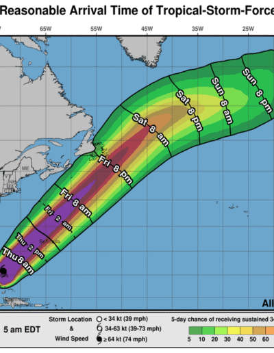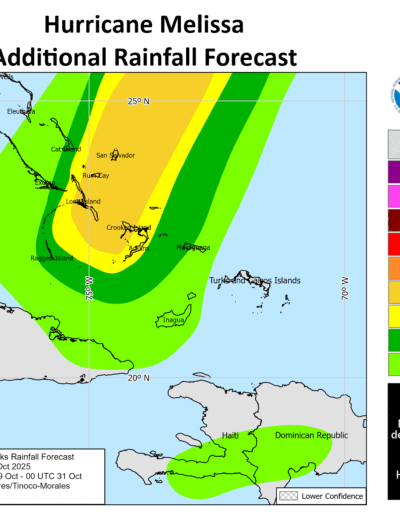 Across Bermuda, outer bands east of Melissa’s track may bring up t an inch (25 mm) of rain today and tonight.