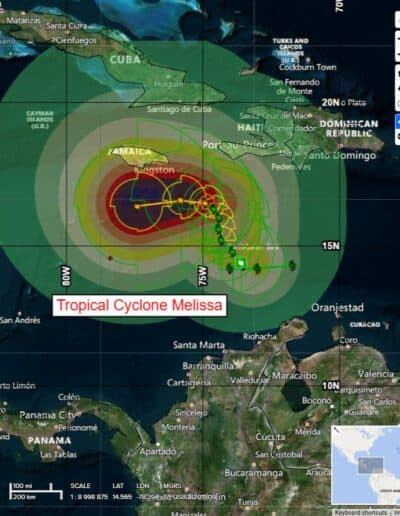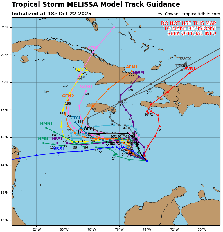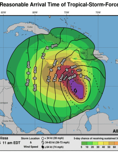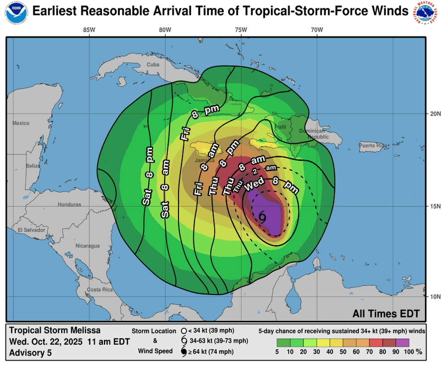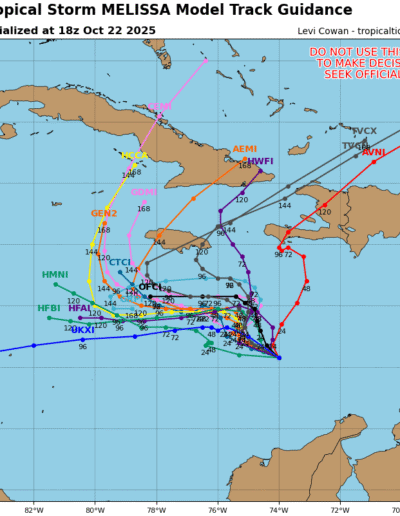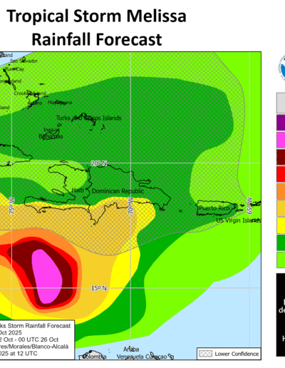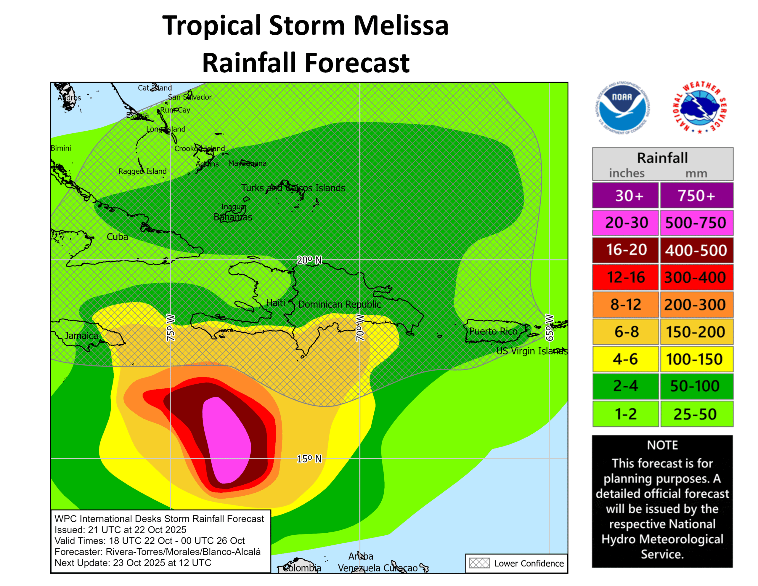 RAINFALL: Melissa is expected to bring 5 to 10 inches of rain to the southern Dominican Republic, southern Haiti, and eastern Jamaica through Saturday, with locally higher amounts possible. Additional heavy rainfall is possible beyond Saturday; however, uncertainty in Melissa’s track and forward speed reduces confidence in exact totals. Significant flash flooding and landslides are possible.