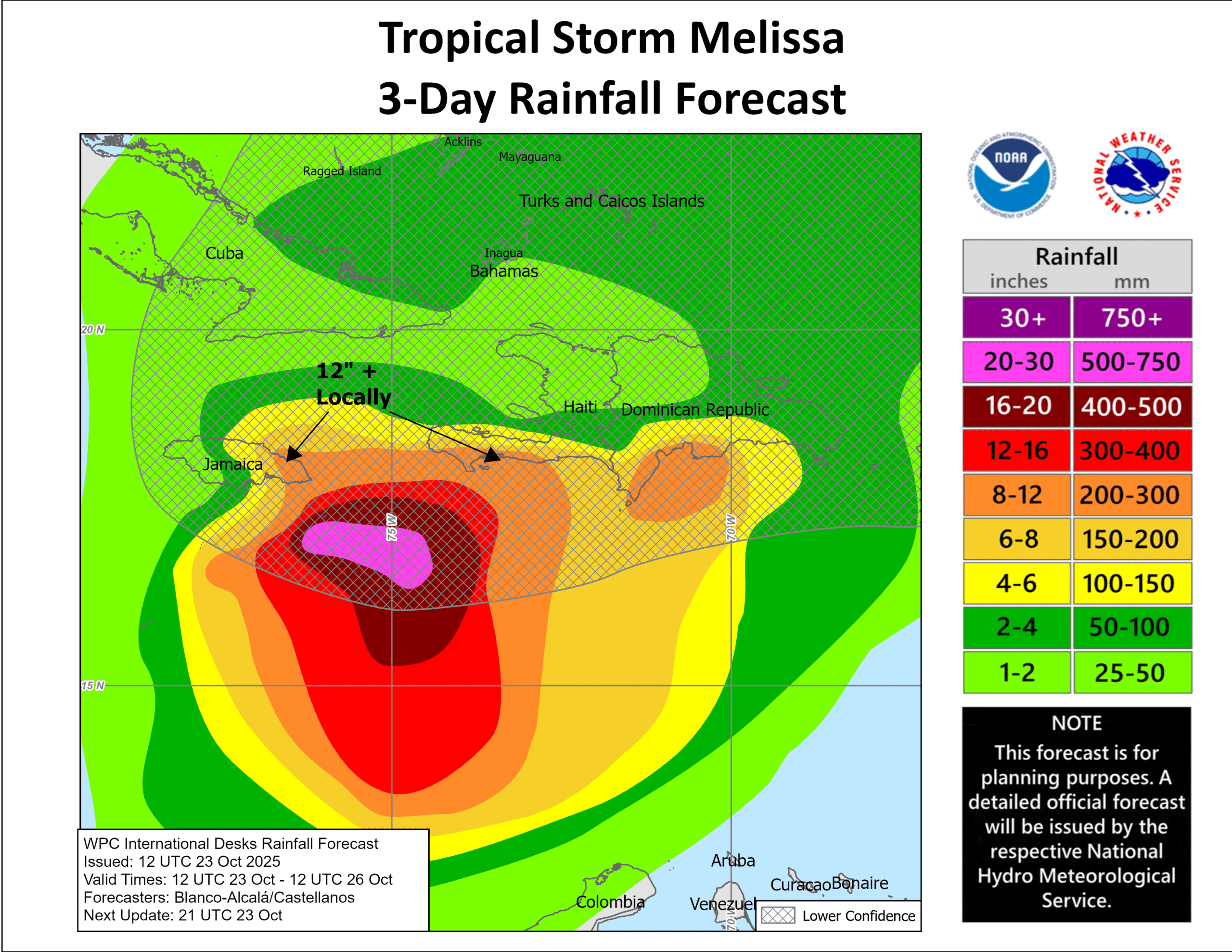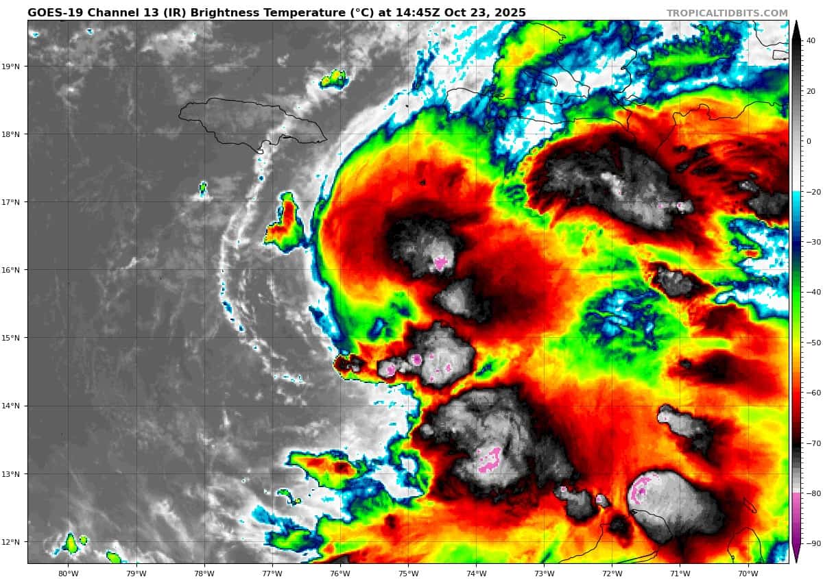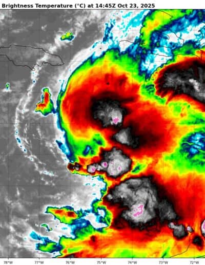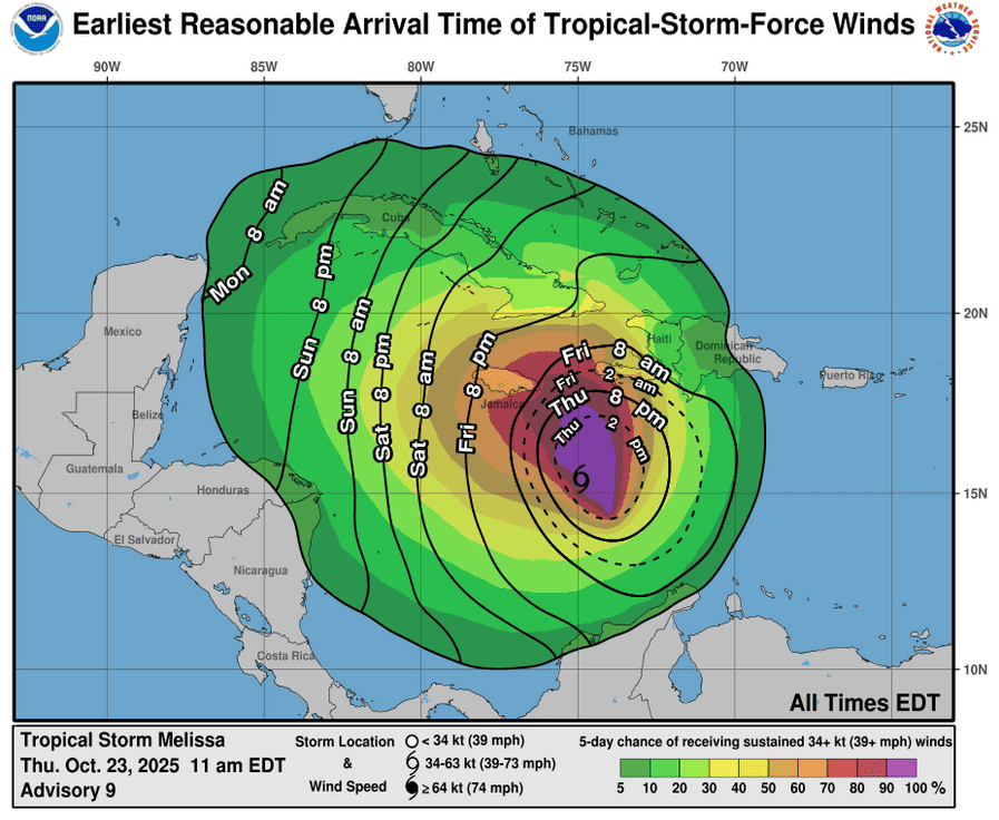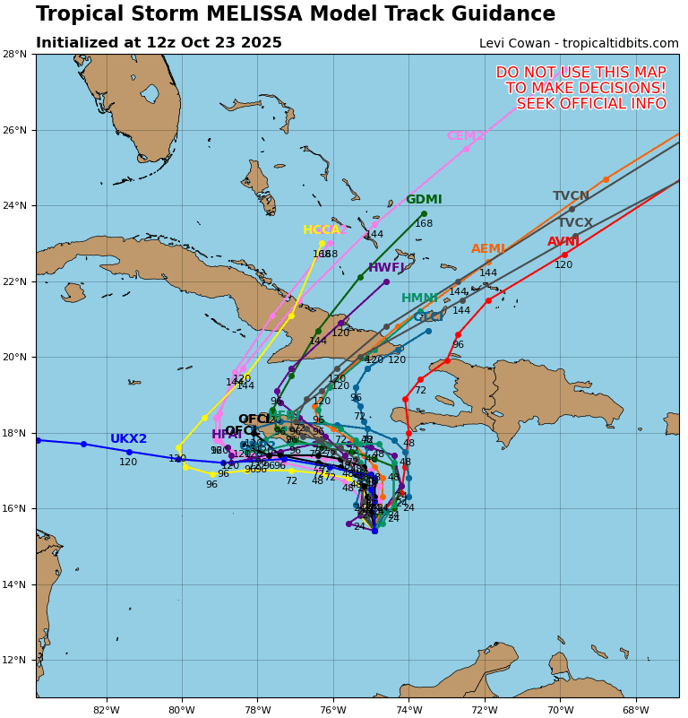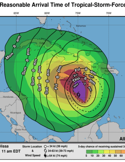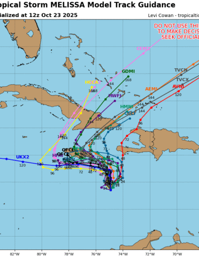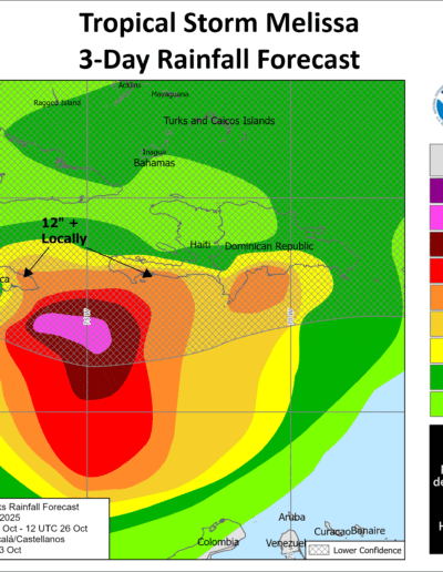 RAINFALL: Melissa is expected to bring 6 to 12 inches of rain to the southern Dominican Republic, southern Haiti, and eastern Jamaica through Sunday, with locally higher amounts possible. Additional heavy rainfall is likely beyond Sunday. However, uncertainty in Melissa’s track and forward speed reduces confidence in the exact totals. Regardless, significant, life-threatening flash flooding and numerous landslides are expected.