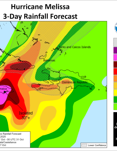 RAINFALL: Melissa is expected to bring rainfall of 15 to 30 inches to portions of Jamaica and additional rainfall of 8 to 16 inches for southern Hispaniola through Wednesday, with storm total local maxima of 40 inches possible. Catastrophic flash flooding and numerous landslides are likely.