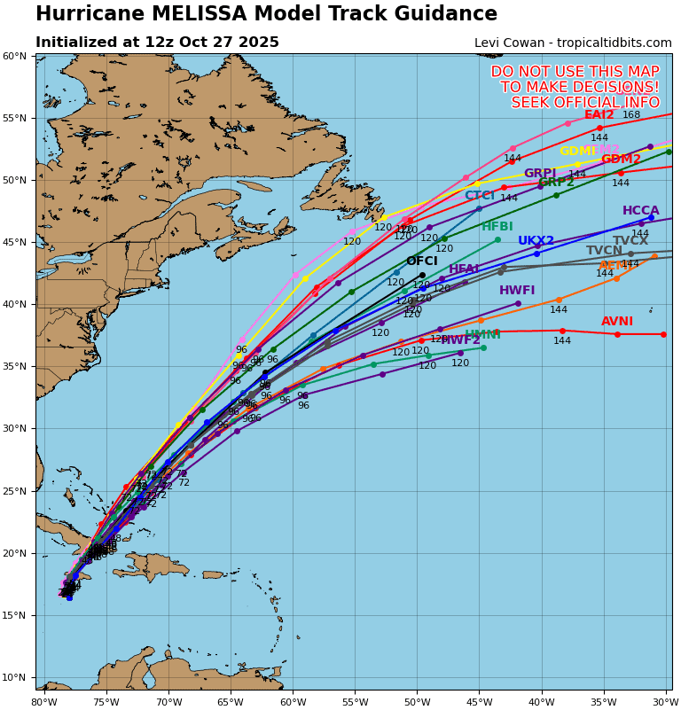 Melissa is moving toward the west near 3 mph (6 km/h). A slow turn toward the northwest and north is expected today and tonight, followed by a northeastward acceleration beginning on Tuesday and continuing through at least Thursday. On the forecast track, the core of Melissa is expected to move near or over Jamaica tonight and Tuesday, across southeastern Cuba Tuesday night, and across the southeastern Bahamas on Wednesday.