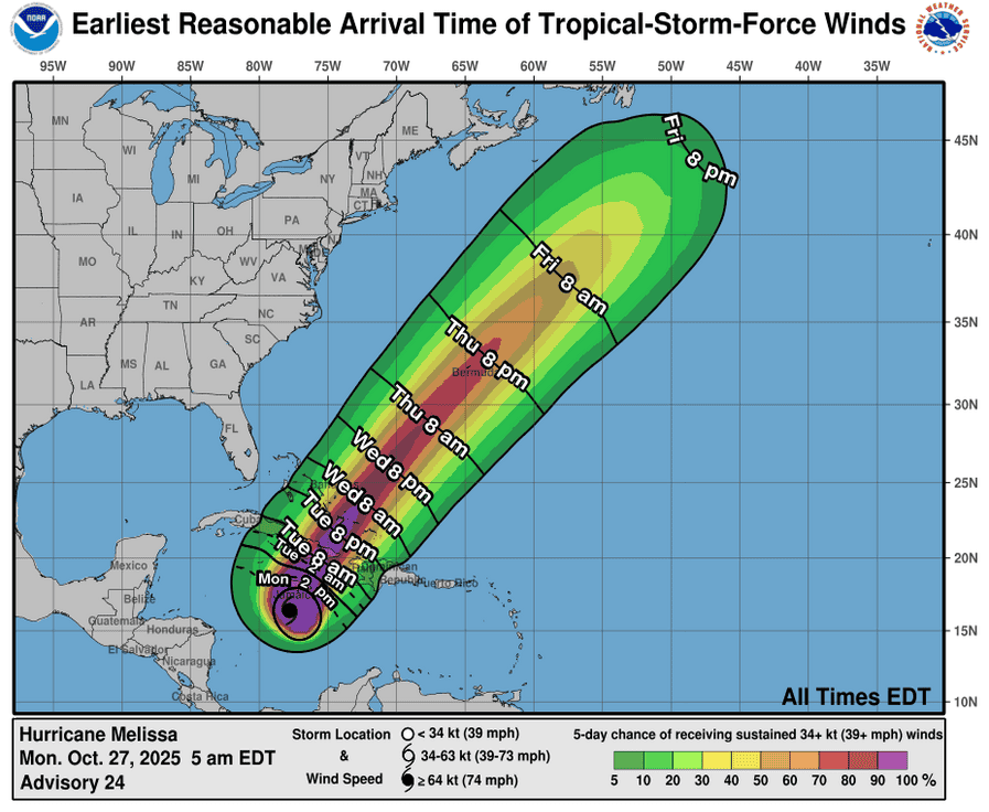 RAINFALL: Melissa is expected to bring rainfall of 15 to 30 inches to portions of Jamaica and additional rainfall of 8 to 16 inches for southern Hispaniola through Wednesday, with storm total local maxima of 40 inches possible. Catastrophic flash flooding and numerous landslides are likely.