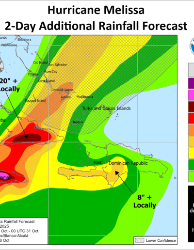 RAINFALL:Melissa is expected to bring rainfall of 15 to 30 inches to portions of Jamaica and additional rainfall of 6 to 12 inches for southern Hispaniola through Wednesday, with storm total local maxima of 40 inches possible. Catastrophic flash flooding and numerous landslides are likely.
