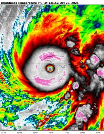NOAA and Air Force Reserve Hurricane Hunter aircraft will be investigating Melissa this evening. Hurricane-force winds extend outward up to 30 miles (45 km) from the center and tropical-storm-force winds extend outward up to 195 miles (315 km). The estimated minimum central pressure is 921 mb (27.20 inches).