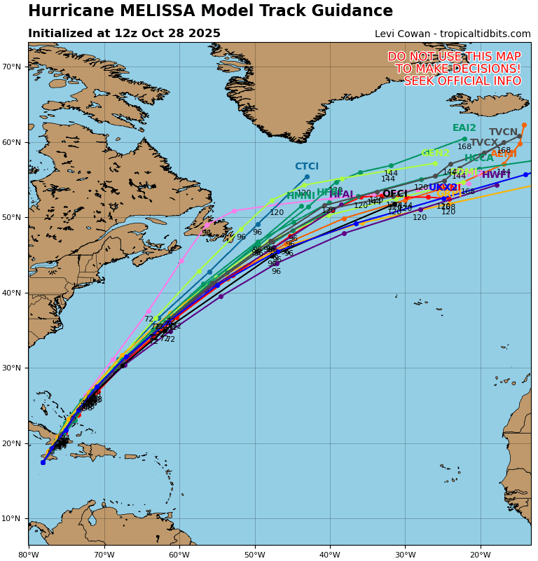 RAINFALL:Melissa is expected to bring rainfall of 15 to 30 inches to portions of Jamaica and additional rainfall of 6 to 12 inches for southern Hispaniola through Wednesday, with storm total local maxima of 40 inches possible. Catastrophic flash flooding and numerous landslides are likely.