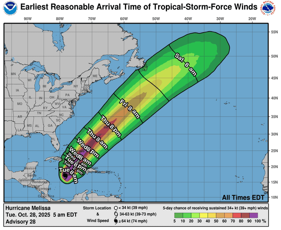 Melissa is moving toward the north-northeast near 8 mph (13 km/h). A turn toward the northeast with an increase in forward speed is expected this evening, followed by a faster northeastward motion on Wednesday and Thursday. On the forecast track, the core of Melissa will move away from western Jamaica this evening. After that, the center is expected to move over southeastern Cuba later tonight and early Wednesday morning, move across the southeastern or central Bahamas later on Wednesday, and approach Bermuda Thursday and Thursday night.